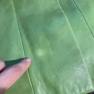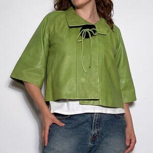 Vintage Y2K genuine leather cropped jacket with swing cut and oversized button in the most unique avocado green! Such a unique piece.