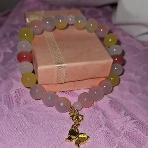 This elegant bracelet features a stunning array of multicolored beads, complemented by very charming gold butterfly + flower pendants. Perfect for adding a touch of sophistication & bright colors to any outfit.