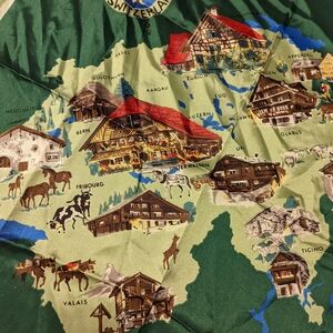 Elegant green "silk" scarf featuring a detailed map of Switzerland. Perfect for adding a touch of sophistication to any outfit.