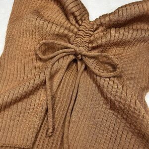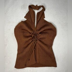 Brown Ribbed Collared Halter Top With Drawstring Ruching.
