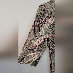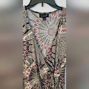 Connected Apparel womens dress, chic faux wrap-style, flattering v-neckline, 3/4 sleeves, black, burgandy. white paisley design, sophisticated look, soft fabric, stretchy, comfortable, stylish, casual, business casual, parties, night out