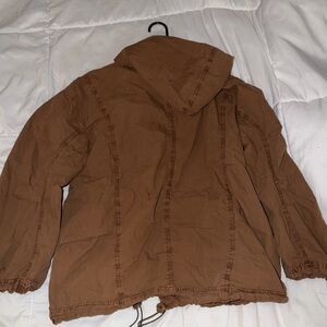 Casual tan windbreaker with hood. Features front pockets and drawstring hem. Ideal for layering.