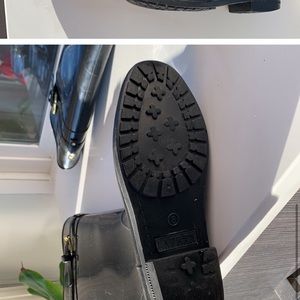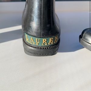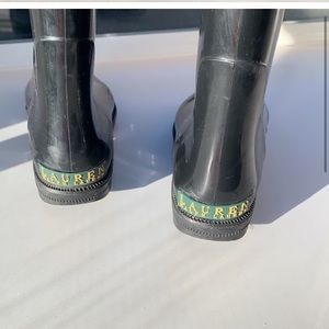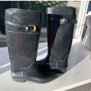 Sleek black rain boots. Gold buckle detail. Durable and stylish.