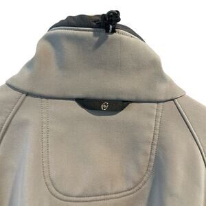 Excellent pre-owned condition Columbia Titanium midweight soft shell zip front jacket. Men’s size large in light gray with brown accent at front pocket, great neutral piece. Lots of pockets for storage, one at chest with full zip and two at hip with full zipper closure as well. All zippers function as they should. Interior is solid charcoal gray fleece and has mesh pockets on both sides as well. Back of neck has a bungee cord at to cinch and adjust collar as needed. Jacket also has monochromatic stitched Columbia logo near bottom hem on front.