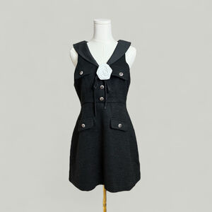 features to note: tweed material / color in black / silver decorative floral buttons / removable white rose / v-neckline / collared / faux pockets / zipper closure at the back / black ribbon at the front