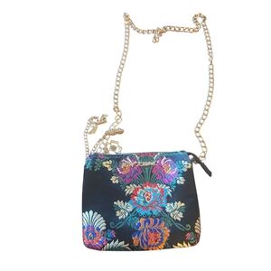 Stunning Betsey Johnson crossbody bag featuring intricate, colorful floral embroidery on a black background. Comes with a chic gold-tone chain strap and Betsey Johnson charms. Perfect for adding a pop of color to any outfit.