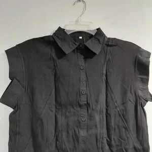 Discover a chic and versatile addition to your wardrobe with this stylish black shirt dress. The flattering collared neckline and button-front closure offer a polished look, while the sleeveless design keeps you cool and comfortable. The subtly defined seams create a streamlined silhouette, leading to a playful ruffled hem that adds a touch of feminine charm. Perfect for a casual day out, a relaxed office environment, or a weekend brunch.