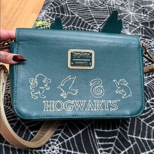 Charming Harry Potter crossbody bag with a castle design. Features green and gold tones. Perfect for fans and collectors. Has some bending on the top of castle part as seen in pictures.