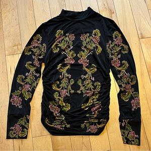 New With Tags Farm Rio Black Ravenala Jersey Blouse. “Embrace the enchanting allure of the Black Ravenala Jersey Blouse by FARM Rio. This piece features a striking high neckline and an exquisite floral pattern that dances across the fabric in vibrant hues. The form-fitting silhouette offers a graceful touch, while the playful botanical design evokes a sense of warmth and wonder. Perfect for expressing individuality with elegance and flair. 85% RAYON 15% ELASTANE.” Machine washable. 14.523.5