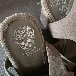 Chic Vince Camuto wedges. Suede straps with braided detail. Perfect for casual elegance.