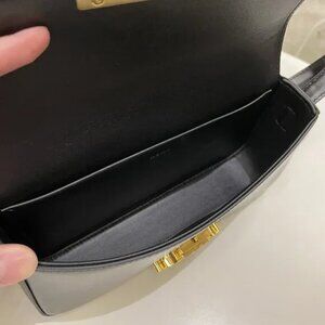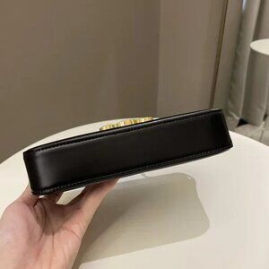 Elegant black leather shoulder bag featuring a striking gold accent. Perfect for any occasion, offering both style and functionality.