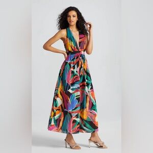 Maxi Dress, bright vibrant colors size medium. Deep v-neck, zippered back with key hole detail. 100% cotton, lined down to knee. NEW