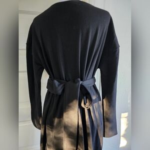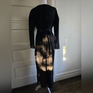 Chic black dress with long sleeves. Features a wrap detail at the waist. Perfect for elegant occasions.