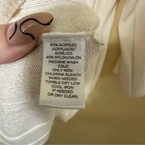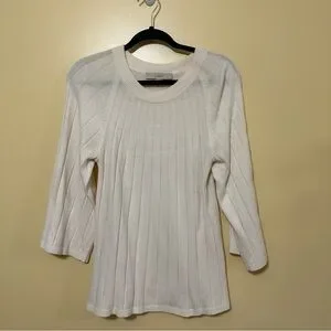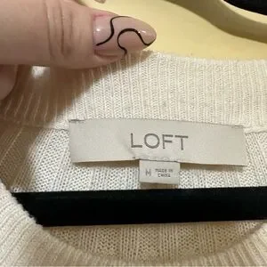 The Loft A-line Ribbed Flare Sleeve Round Neck Sweater in cream color is a stylish and versatile addition to any woman's wardrobe. This 3/4 sleeve sweater features a flattering A-line silhouette with a round neckline, making it a classic and preppy choice. Made from a cozy knit fabric blend of nylon and acrylic, this pullover sweater offers stretch for a comfortable fit. The simple solid design and flared sleeves add a touch of elegance, perfect for a casual or dressy look. Representing the brand LOFT, this sweater in size medium is a must-have for any fashion-forward woman.