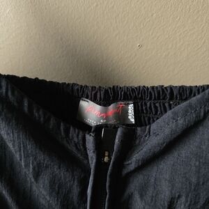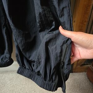 Features: Water-resistant, durable fabrication for outdoor performance; shiny finish; adjustable empire-style waist; wide, relaxed harem leg with elasticated cuff; zipper openings at lower leg for adjustable fit; full-length zipper opening; adjustable shoulder straps; large side seam pockets