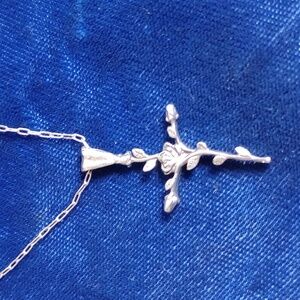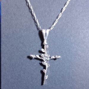 This stunning Sterling silver cross pendant features a beautiful floral design, adding elegance to any ensemble. Perfect for both everyday wear and special occasions.