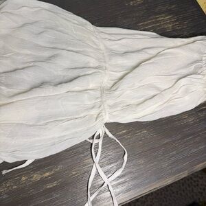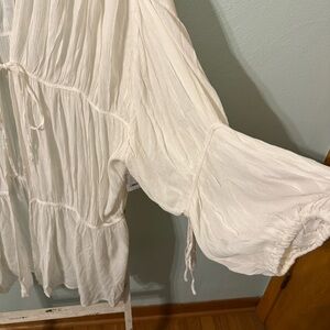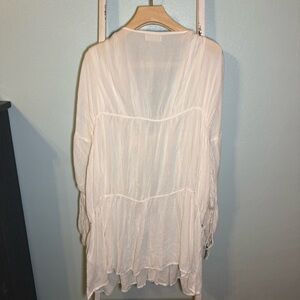The duster top has a drapey, tiered design with a pleated fabrication and exaggerated, billowy sleeves. New! See Free People website for pictures of fit.