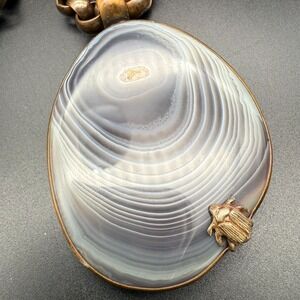 * A small bronze scarab beetle embellishment is mounted toward the bottom of the stone, giving it an artistic, ancient feel.