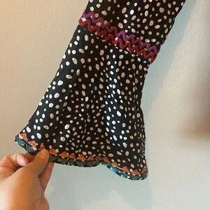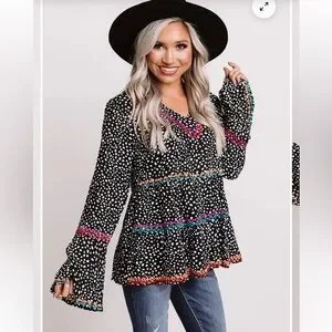 Chic and stylish, this black polka dot top features vibrant accents and flare sleeves. Perfect for any occasion.