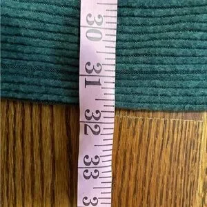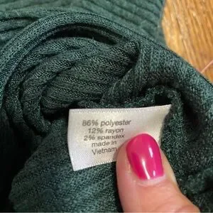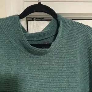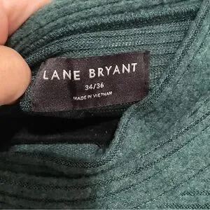 This is a hunter green tunic by Lane Bryant. It is ribbed, has a slight mock neck collar and is a polyester and rayon blend. The tunic is a size 34/36.