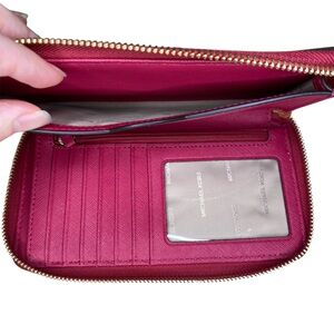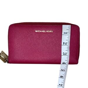 Michael Kors Jet Set Travel Large Smartphone Wristlet in colour cranberry. Features a zip closure, gold hardware, internal card clots, ID slot, zip compartment, cash compartment, and wrist strap. Clean and in excellent condition, only used for 1 outing. Very very minor scuffing on the hardware. Measures 7" long by 4" tall
