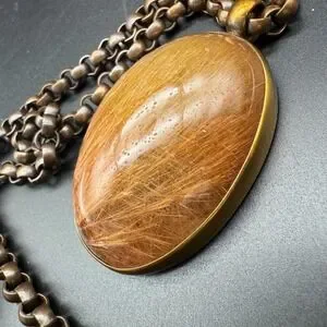 The necklace features a large, sculptural oval pendant crafted from rutilated quartz, suspended from a heavy, antique bronze-tone chain. The eye-catching toggle clasp adds a touch of industrial elegance and ensures secure wear.