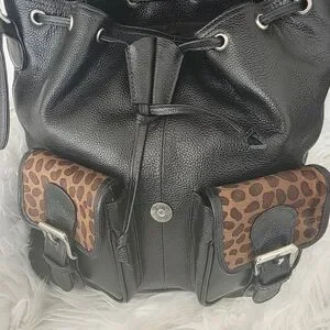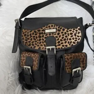 Chic black leather backpack with bold brown leopard print details in genuine calf hair. Perfect for adding a touch of wild elegance to your outfit.