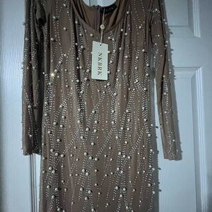 Turn heads with this glamorous long sleeve tan dress, adorned with sparkling embellishments. Perfect for any special occasion, this dress combines elegance and style effortlessly.