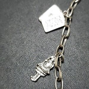 Adorable silver colored bracelet has Alice in wonderland themed charms.