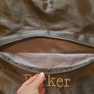 Thirty One Drawstring Cinch Sac Backpack. Black gray twill pattern, durable & lightweight, sporty, made of polyester, black drawstring closure, woven cord straps for a comfortable fit, front zipper pocket with flap (zipper is broken), gray "Parker" embroidered monogram. 14.5" X 18.5".