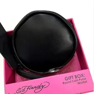 These round zip coin purses feature Ed Hardy’s iconic rhinestone heart tattoo design in two colorways — one crisp white and one sleek black — giving you two edgy looks in one fun, gift-ready set.