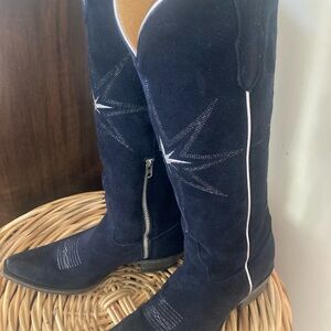 Distinctive ultra-dark indigo suede knee-high boots featuring star stitching and side zippers. Absolutely stunning!