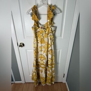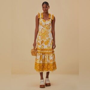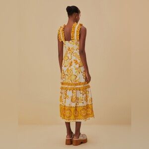 Sink into the tropical reverie of the Off-White Aura Floral Midi Dress by FARM Rio. This captivating piece draws the eye with its vivid yellow floral patterns blooming across an off-white canvas. The dress, adorned with playful ruffles, boasts a square neckline that complements the tiered skirt, crafting an effortlessly chic silhouette. A delicate confluence of charm and whimsy, it's a dress designed to celebrate the spirit of summer all year round.