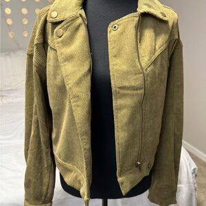 Mine by A'gaci olive green corduroy bomber jacket, trendy cropped style with western accents.
