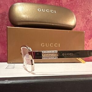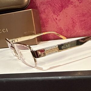 Elegant Gucci glasses. Features gold and brown accents. Comes with branded case.