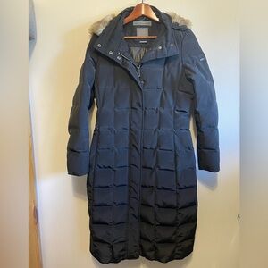 GEOX- black midi quilted puffer jacket with fur hood, size 6