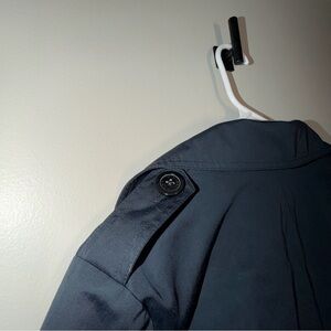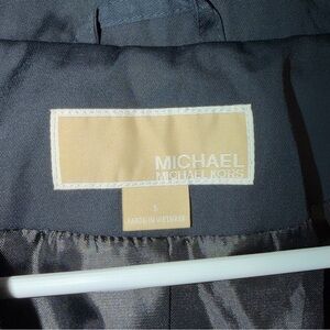 Stylish black trench coat by Michael Kors. Features a sleek design with button closure. Ideal for versatile wear.