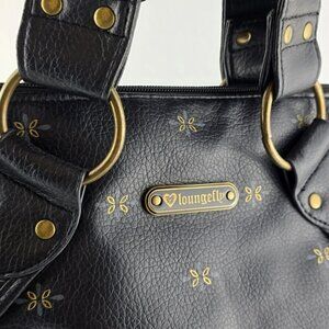 Stylish black tote bag featuring a colorful embroidered sugar skull design with floral and heart details. Unique statement piece with sturdy shoulder straps and decorative hardware accents. Spacious interior β perfect for everyday use or adding an edgy, artistic touch to any outfit.