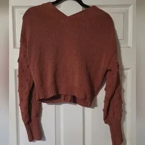 Chic terracotta cardigan with button-up front. Features textured sleeves. Ideal for layering.