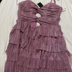 Chic pink maxi dress with tiered layers. Features a stylish cutout design. Ideal for elegant occasions.