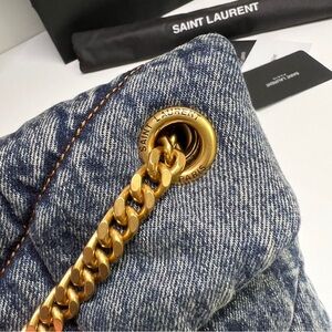 Stylish denim bag with elegant gold chain. Iconic YSL logo on front. Perfect for any occasion.