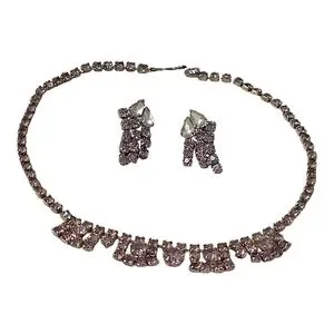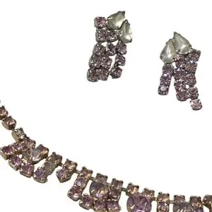 Charming necklace with matching earrings. Features pink and white stones. Ideal for adding sparkle.