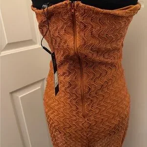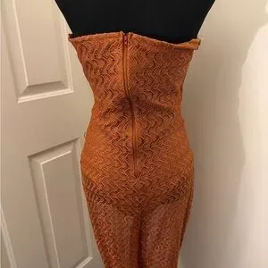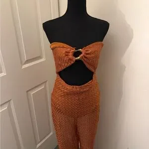 Chic orange jumpsuit with textured fabric. Strapless design with front ring detail. Perfect for stylish outings.