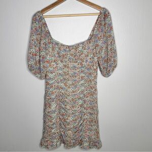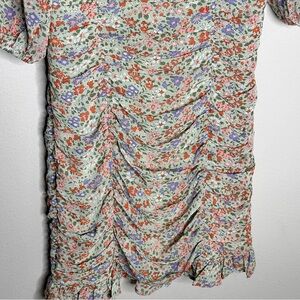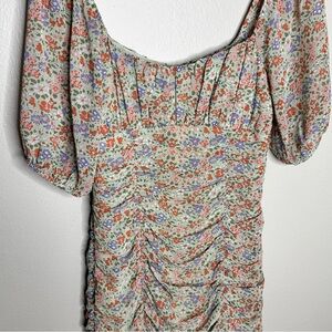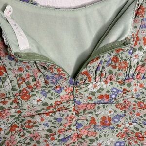 Mini dress features a sage (light green/off-white) base with a vibrant all-over floral print in various colors, including pink, purple, and orange.