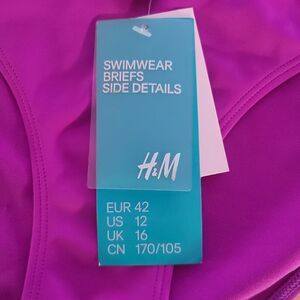 The product is a pair of brand new with tags H&M purple pleated bikini bottoms in size 12. These solid purple bottoms are designed for regular size women and are machine washable for easy care. The pleated accents add a stylish touch to the bikini bottom style, making it a fashionable choice for beach or poolside wear. Please see pics for measurements