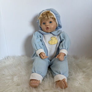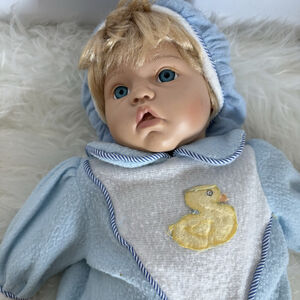 This collectible doll has a vinyl head, arms, and legs with a soft cloth body, allowing for natural posing. The sculpt includes realistic newborn facial features such as full cheeks, softly parted lips, detailed hands and feet, and expressive baby blue eyes.
