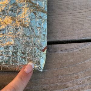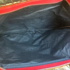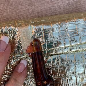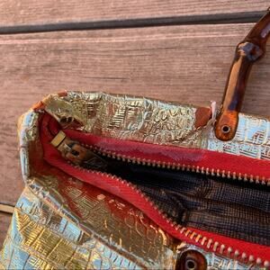 Vintage 60s Lady’s Pride gold foil gator print handbag. Zipper closure. Lining in great condition. Gold foil has multiple flaws. Usable as is or recover the outside. Plastic handles reminiscent of bamboo wood handles.