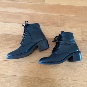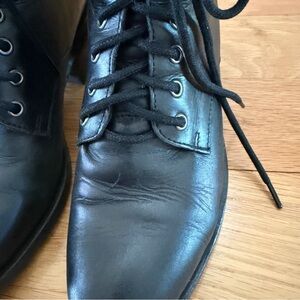 Black leather lace-up ankle boots with antique silver eyelets. Almond toe shape. In good used condition and very comfortable to walk in/wear all day.