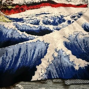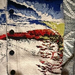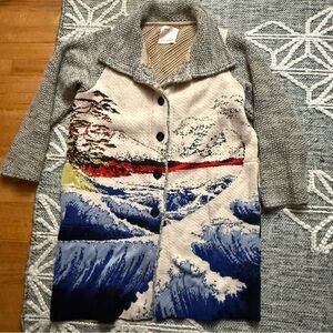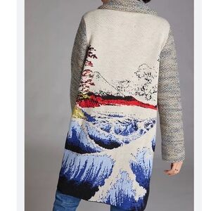 One of the most sought after Anthropologie pieces ever sold: the Aldo Martins Ocean Funnel Neck Sweater Coat! Absolutely stunning knit pattern pays homage to Great Wave Off Kanagawa by Hokusai.