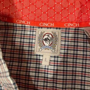 This gently used Cinch button up Men's western shirt. Red and Black plaid shirt, size Large. See photos for detailed color pattern and measurements. This will make a classy addition to any closet.